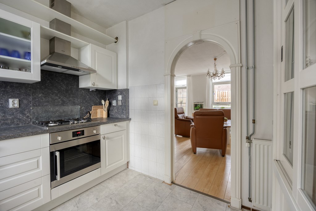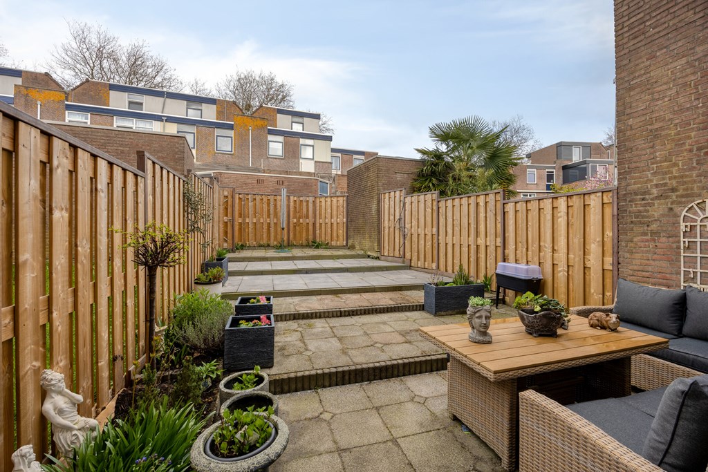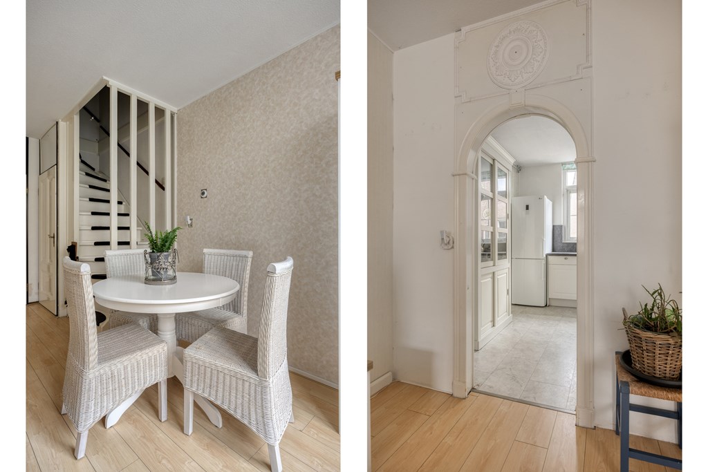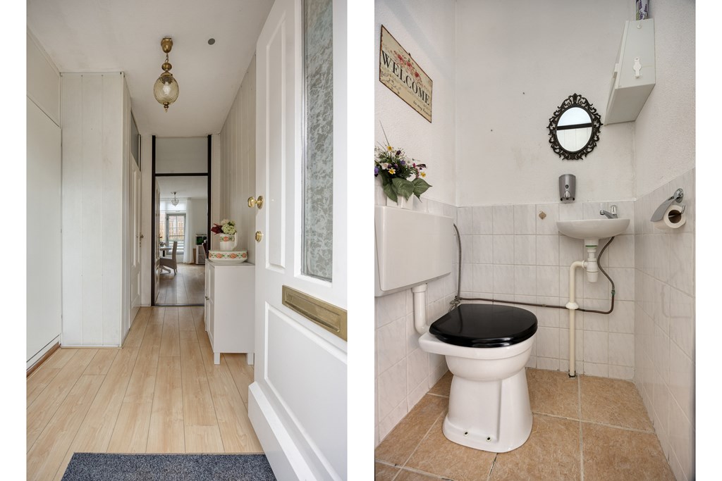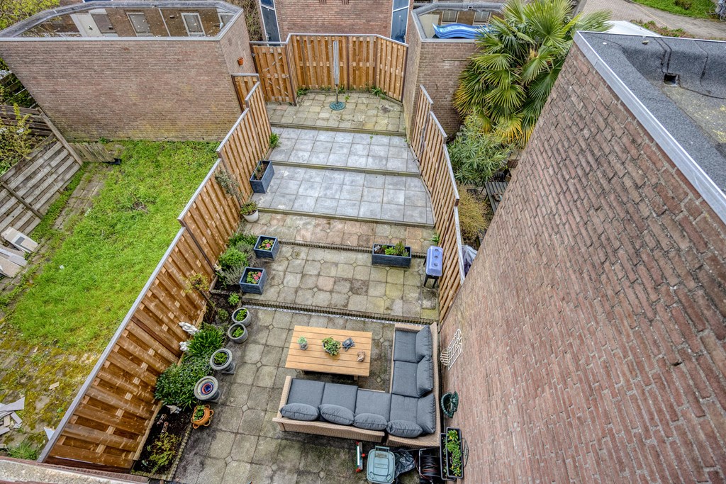 Je komt het huis binnen in een ruime en lichte hal. Daar vind je ook het toilet. De glazen deur geeft al een snelle blik in de woonkamer. Ook deze valt op door het invallende daglicht en de ruimte. Plek genoeg voor een bankstel en eettafel. De half open keuken is eveneens ruim en heeft alle apparatuur die je nodig hebt om lekker te kokkerellen. De keuken beschikt verder over veel opbergruimte. We lopen weer terug naar de woonkamer want we hebben de tuin nog niet gezien. Deze is opvallend diep en onderhoudsvrij aangelegd en heeft verschillende niveau’s. De open trap naar boven is in het midden van de woonkamer.