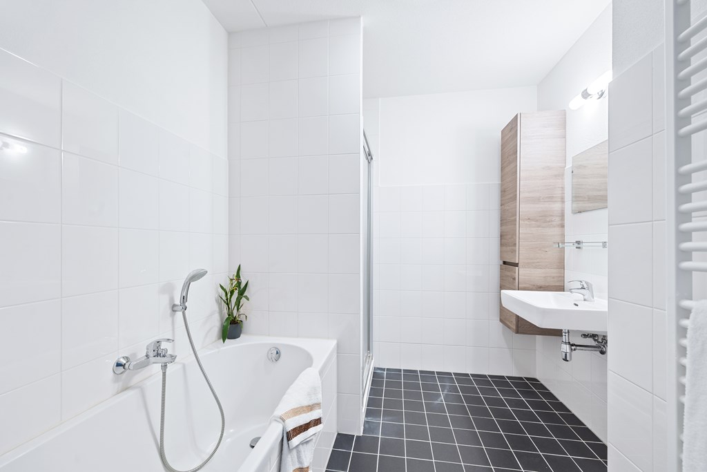 Another door leads to the bathroom, finished in anthracite and white tones. Here you will find a washbasin, walk-in shower, bathtub, designer radiator and a tall storage cabinet. Next to the bathroom is the space for the laundry appliances. Opposite the bathroom are the doors to the toilet and the central heating room.