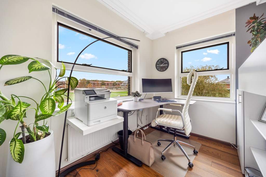 Een nagenoeg even grote slaapkamer kijkt uit op de zijkant van het huis. Deze uitbouw boven de keuken is een grote plus en hier profiteert u van zonlicht van maar liefst drie kanten. Aan de achterkant vindt u nog eens twee slaapkamers. Een ervan heeft een eigen balkon, op de uitbouw van de eetkamer, dat u via openslaande deuren kunt betreden. U kijkt hier uit over het water. De andere slaapkamer is op dit moment in gebruik als gemeenschappelijke walk-in closet. Ideaal, als u de ruimte in de slaapkamers optimaal wilt houden. Toch een extra (kinder/werk)kamer nodig, dat kan, er zit een raam achter de kastenwand!