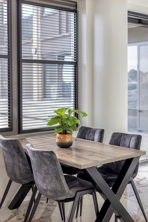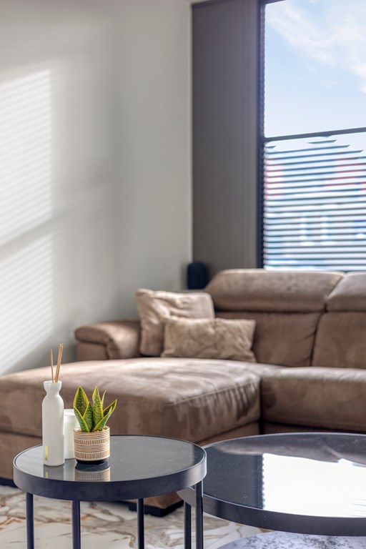 Via de hoofdingang bereik je vrijwel direct het appartement. Binnen kom je in een lichte woonkamer met open keuken, opvallend door de marmeren vloertegels en de overvloedige lichtinval. De keuken is strak en volledig uitgerust met moderne inbouwapparatuur: inductiekookplaat, combi-oven, koelkast, vaatwasser en afzuigkap. De woonkamer biedt ruimte om te ontspannen en nodigt uit tot gezellig samenkomen bij de eettafel.