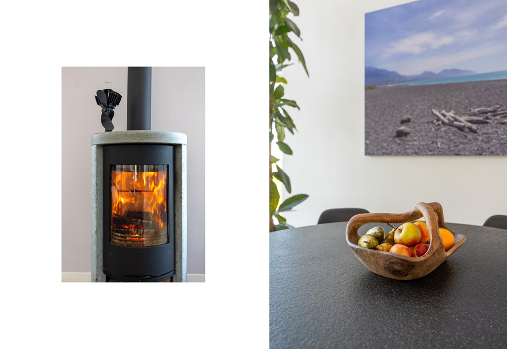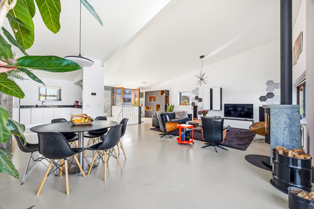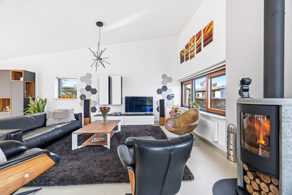 De fraaie gietvloer, de strakke radiatoren met ombouw en de Contura HR-kachel in speksteen geven de ruimte een warme, moderne uitstraling. Luxaflex jaloezieën en Duette shades maken het geheel af.