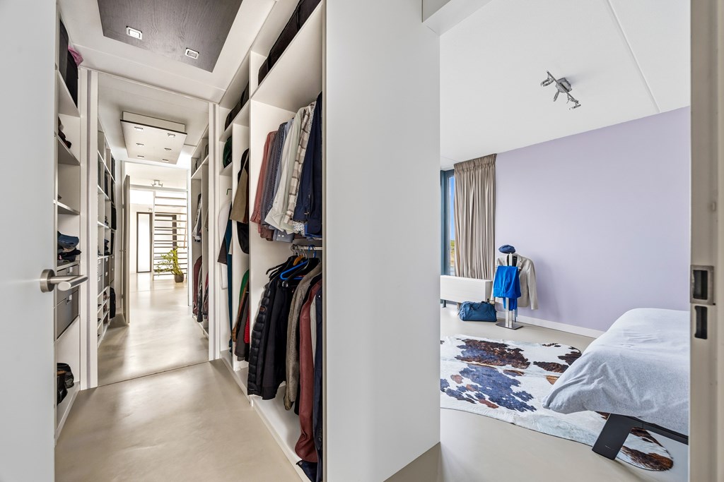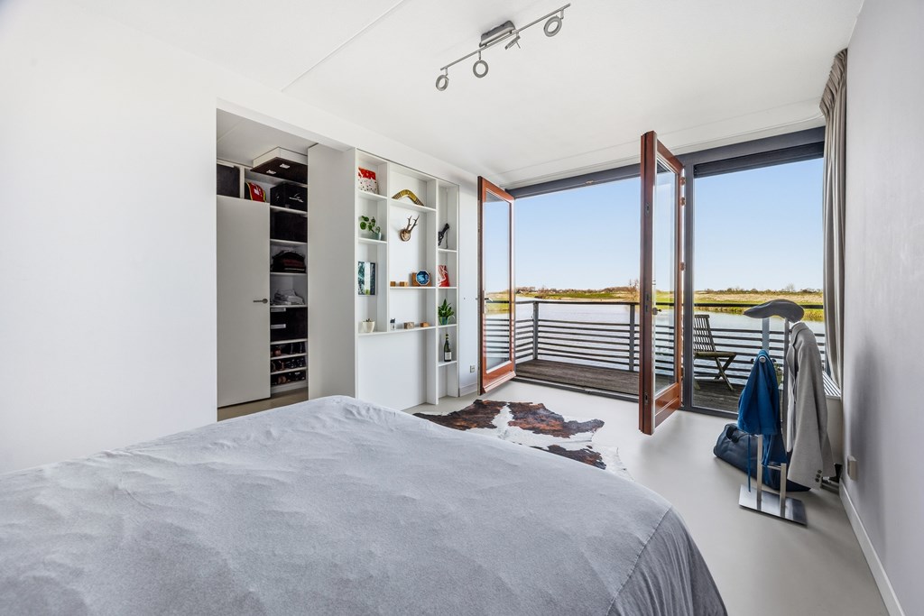 The fourth bedroom is the master bedroom and truly stands out. Extra spacious, with French doors leading to a private balcony above the water. Here you wake up with the soft light of the morning and fall asleep with the silence of the polder. The adjoining walk‑in closet ensures tranquility in the bedroom and adds a touch of luxury to your daily routine.