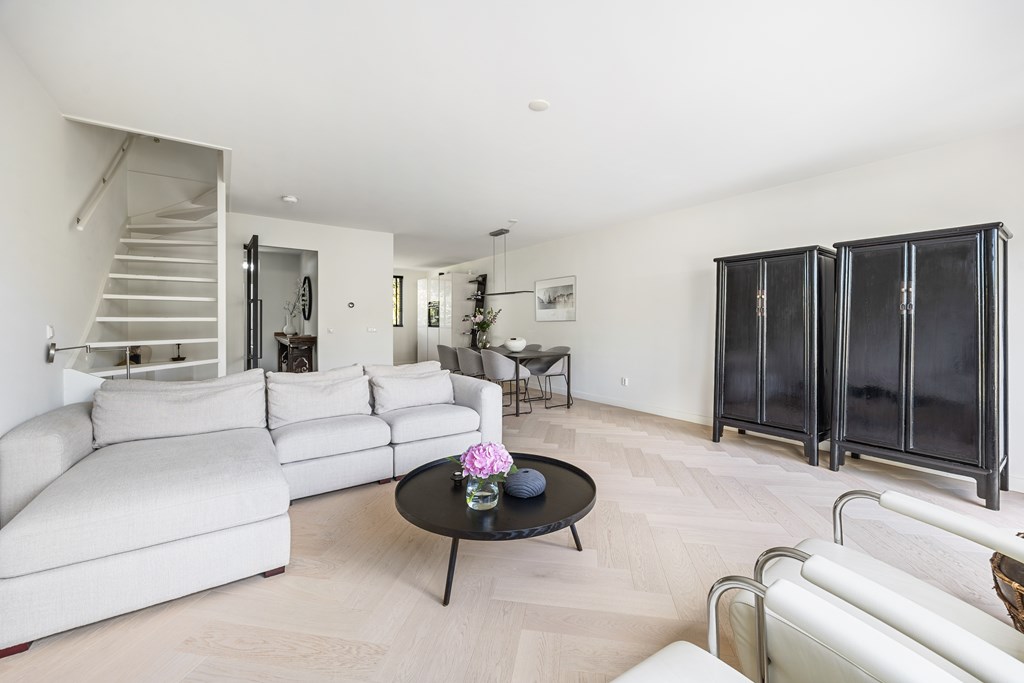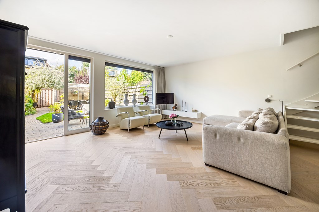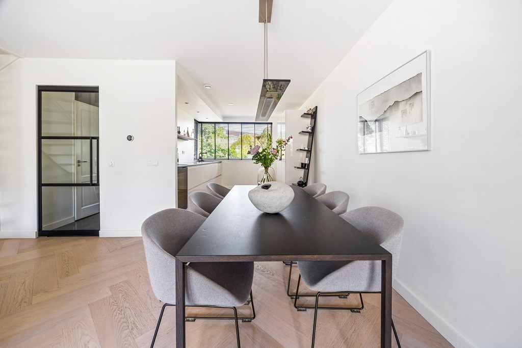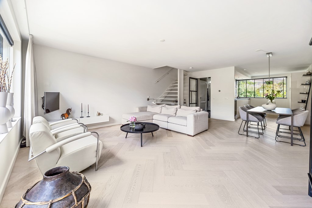 Bij binnenkomst ervaart u direct de hoogwaardige afwerking. De ruime hal met Belgisch hardsteen en de stijlvolle stalen taatsdeur geven een chique eerste indruk. Vervolgens betreedt u de royale woonkamer, waar de prachtige visgraatvloer, de strak gestuukte plafonds en de grote raampartijen zorgen voor een moderne en lichte uitstraling. Openslaande deuren verbinden het binnenleven naadloos met de zonnige achtertuin.