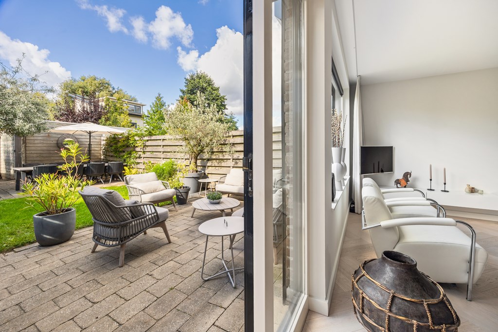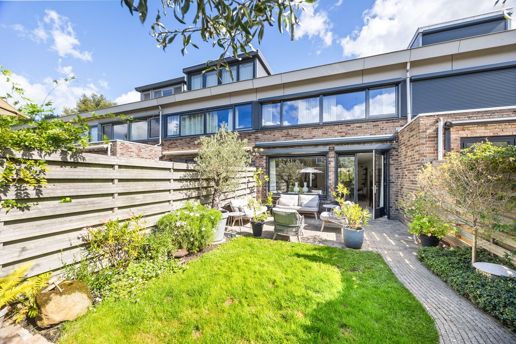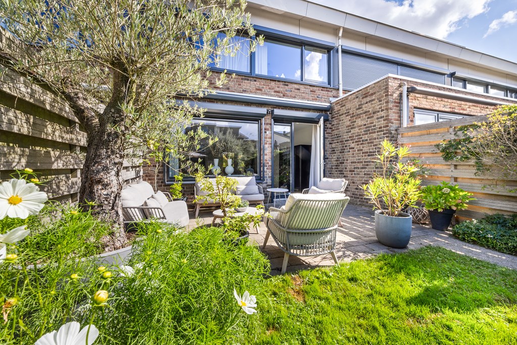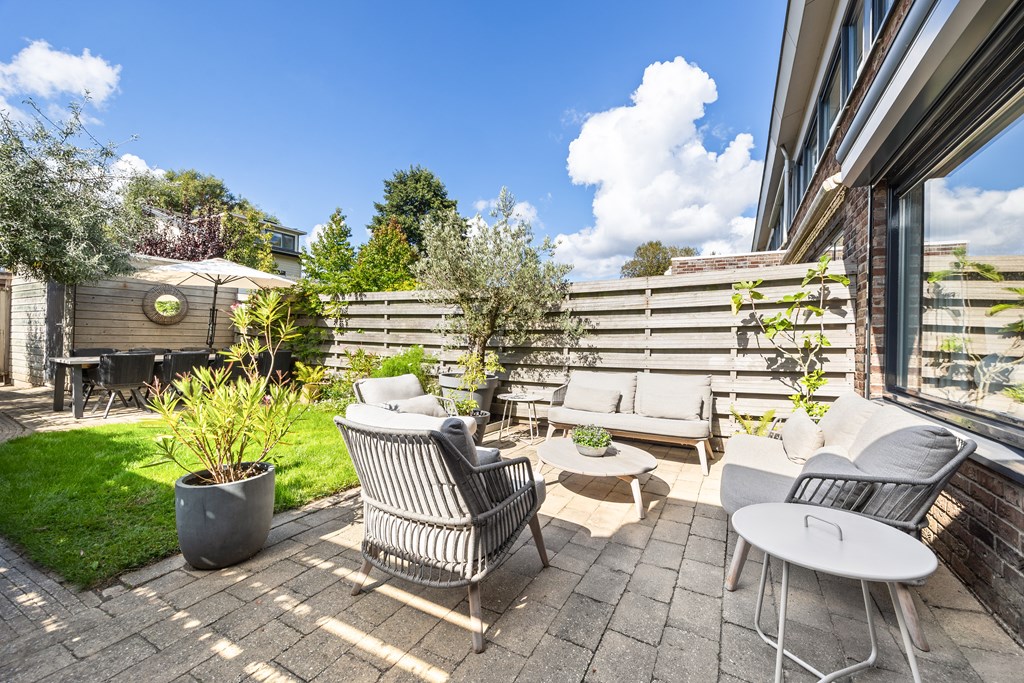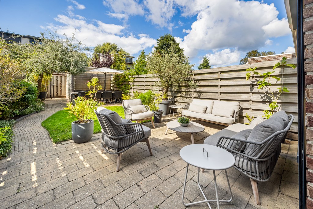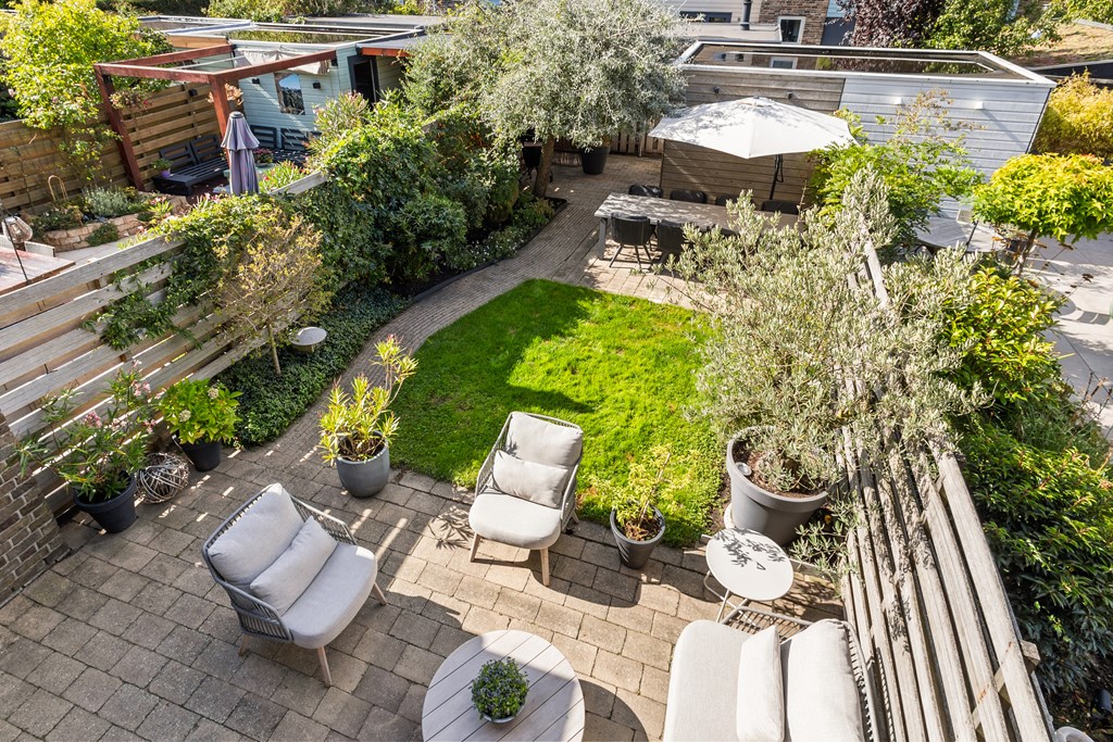 De achtertuin is met zijn diepte van 14 meter een waar buitenverblijf. Gelegen op het zuiden, voorzien van zonwering, diverse terrassen en een ruime berging, geniet u hier van lange zomerdagen in volledige privacy. Ook de verzorgde voortuin draagt bij aan de charmante uitstraling van het huis.