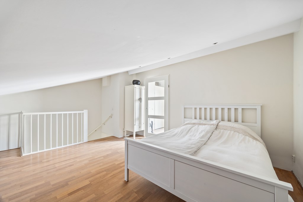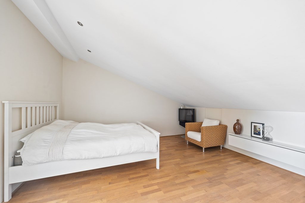 The large open attic is currently used as a guest area, but it could easily accommodate an extra bedroom or workspace, especially with the option to install a large dormer window.