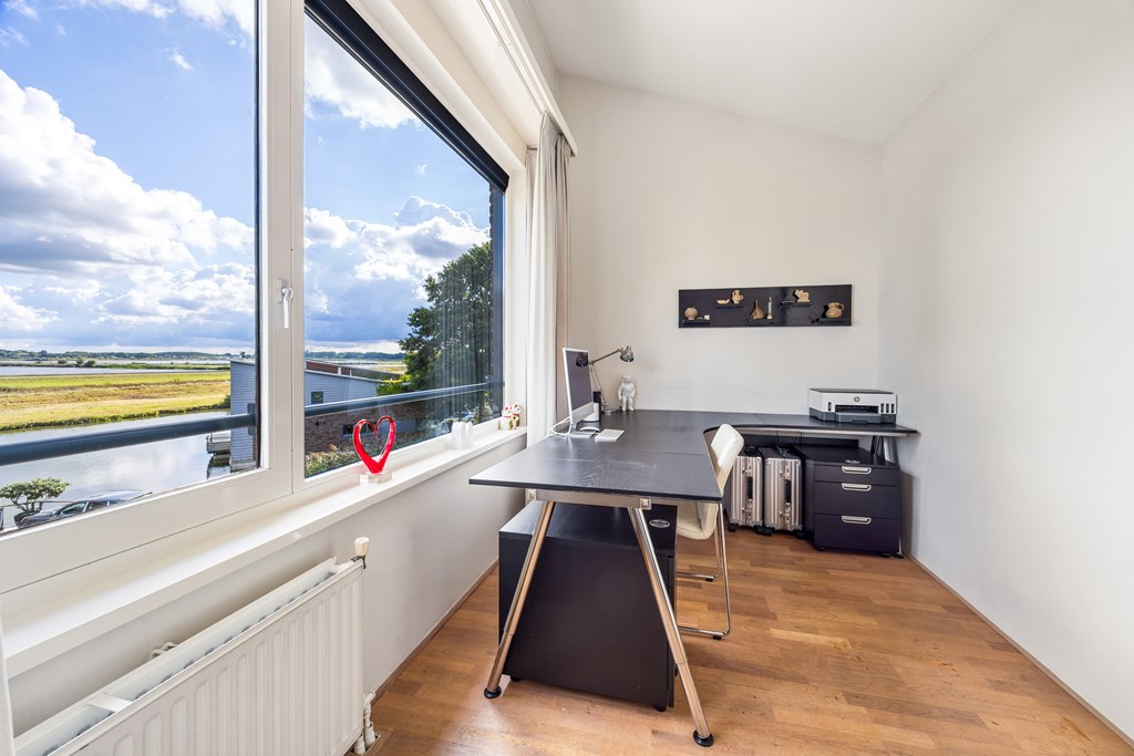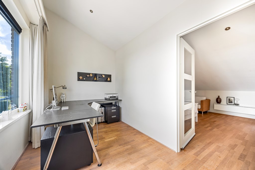 De tweede verdieping is verrassend ruim: een vierde (slaap)kamer aan de voorzijde, nu in gebruik als werkkamer met een weergaloos mooi uitzicht over het natuurlandschap.