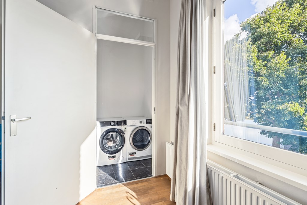 Vanuit deze kamer is er tevens toegang tot de aparte was-/technische ruimte met dezelfde Belgisch hardstenen vloer. In deze ruimte vindt u naast de witgoedopstelling, ook de Cv-ketel en omvormer van de zonnepanelen en er blijft voldoende ruimte over voor overige spullen.