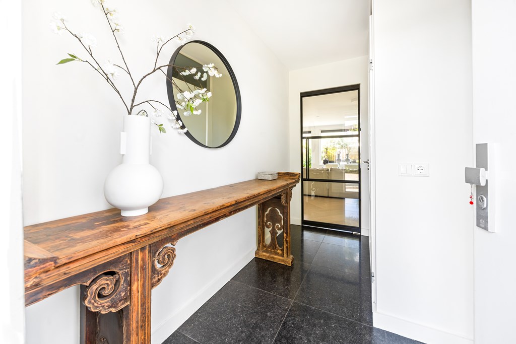 - High-end finish with herringbone floor, steel pivot door, and sleek plasterwork