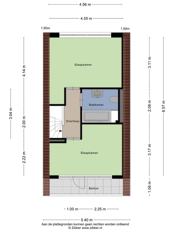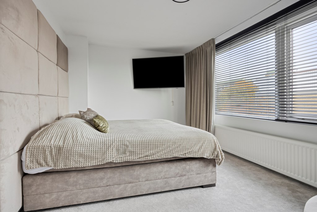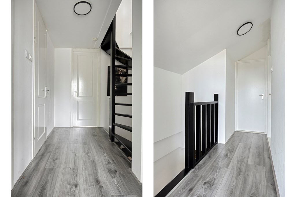 Via de trap vervolgt de weg zich naar het slaapgedeelte op de tweede verdieping. Aan de voorzijde bevindt zich de ruime masterbedroom. Via de grote raampartij heb je hier een prachtig uitzicht. Aan de tuin kant liggen twee kleinere slaapkamers, welke te gebruiken zijn als babykamer, werkplek of inloopkast. Ook kunnen de kamers makkelijk samengevoegd worden tot één grotere slaapkamer. De badkamer is eveneens modern afgewerkt met witte en zwarte tegels. De ruimte is voorzien van douchecabine, spiegel, wastafelmeubel met twee kranen en een toilet.