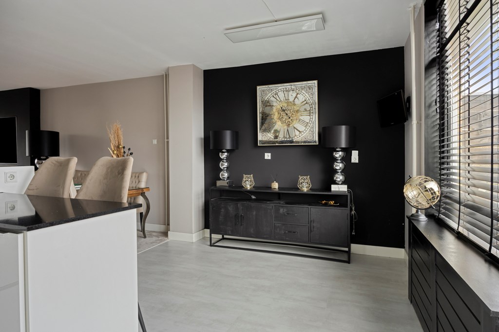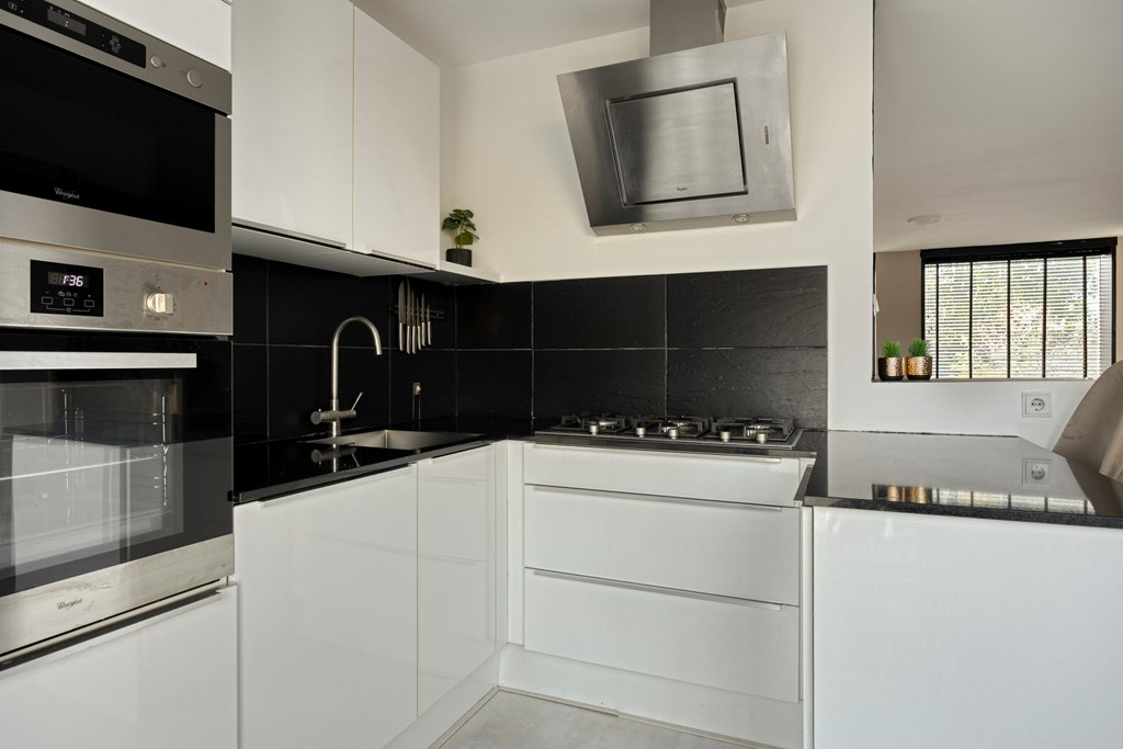 De muren zijn netjes gestuct en op de grond ligt heerlijk zacht tapijt. Naast het eetgedeelte bevindt zich de keuken. Deze is deels afgeschermd en bestaat uit strak afgewerkte witte kastjes en zwarte tegels. Toekomstige bewoners hebben geen werk meer aan de keuken, het is van alle moderne gemakken voorzien, inclusief vijfdelig fornuis. De keuken geeft ook toegang tot een balkon.