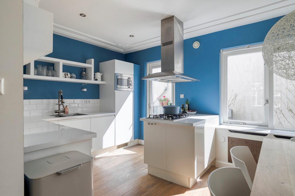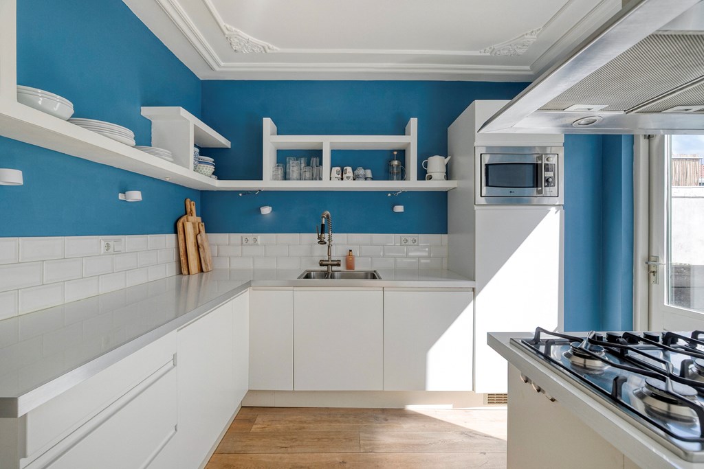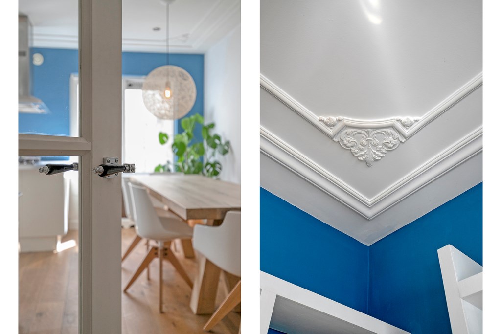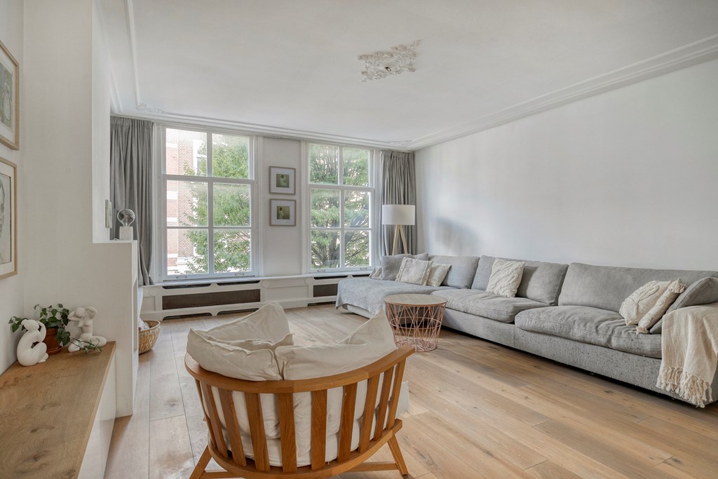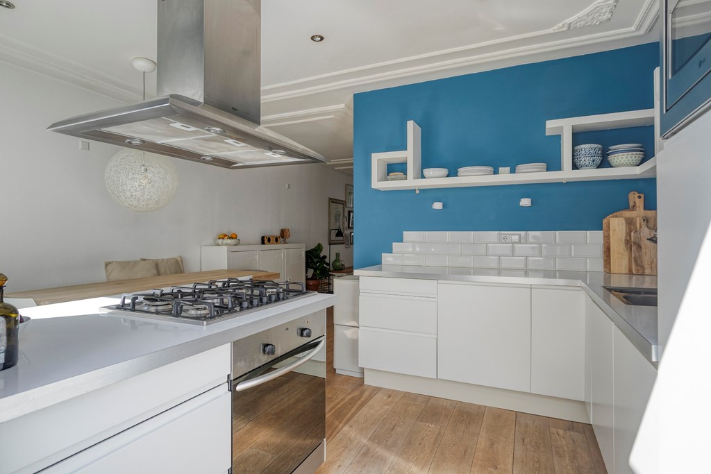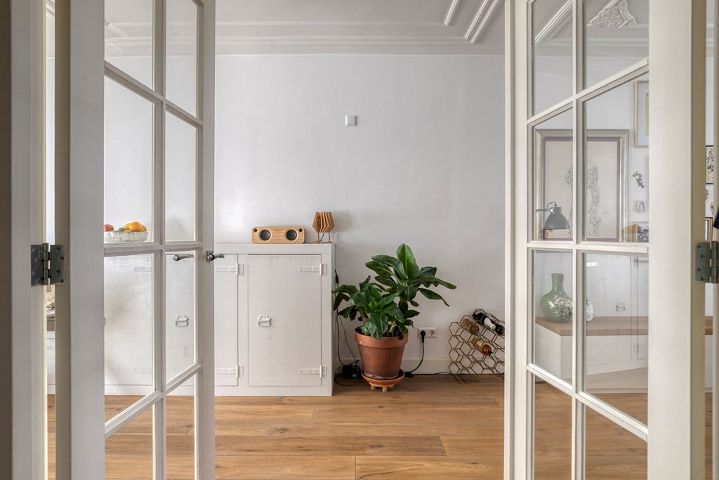 Via de dubbele deur met glazen details kom je in de ruime woonkamer. Deze is erg licht en sfeervol dankzij de twee mooie houten raampartijen. Het plafond is voorzien van sierlijke plafondlijsten en in de woonkamer bevindt zich een rozet, die voor nog meer karakter zorgt. Aan de achterzijde van de woonkamer vind je de keuken, die ruimte biedt voor een zit- en eetgedeelte. Ook hier is het plafond voorzien van sierlijke lijsten en zorgt een raam en deur naar het terras voor veel licht. De keuken beschikt over een groot L-vormig aanrechtblad en een aparte kookgedeelte.