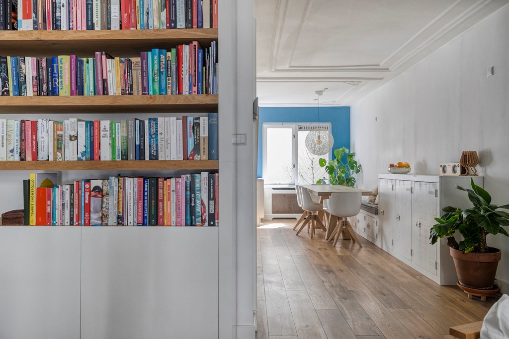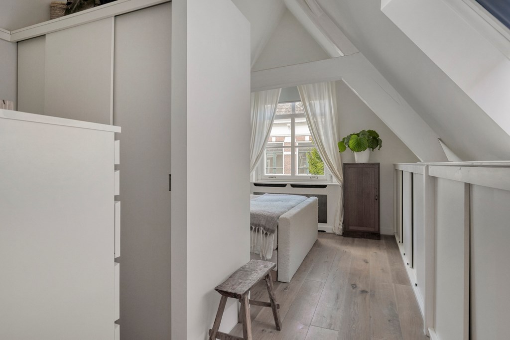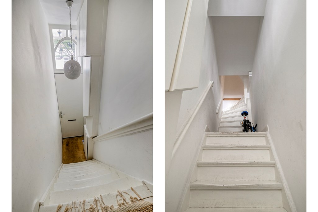 Als je vanaf de straat naar het huis kijkt, valt direct de bijzondere klokgevel op. Het huis is gebouwd rond 1895 en bezit allerlei historische details. Binnen kom je uit op de trap naar boven. Op de eerste verdieping vind je een ruime hal, waar plek is voor het opbergen van jassen en schoenen. In de hal ligt een mooie, eikenhouten vloer die ook is doorgelegd in de rest van het appartement. Aan de linkerzijde bevindt zich een toiletruimte.