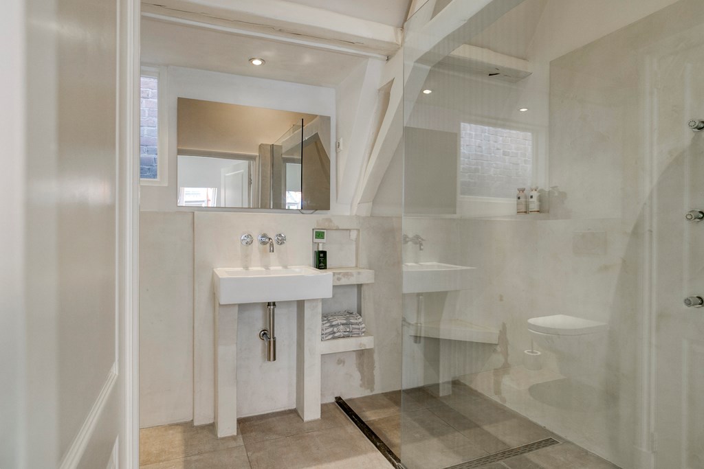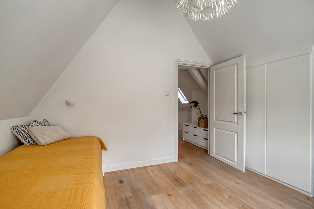 Vanuit de overloop op de bovenverdieping heb je toegang tot twee ruime slaapkamers die tegenover elkaar liggen. De master bedroom bevindt zich aan de rechterkant. De andere slaapkamer leent zich eventueel goed als kantoorruimte en heeft eveneens een aparte kastgedeelte. Beide slaapkamers hebben dankzij de grote ramen lekker veel daglicht. Tussen de kamers in vind je de moderne badkamer met toilet, douche, wastafel met spiegel en ruimte voor wasmachine en droger. De douche heeft een glazen douchewand en de crèmekleurige wandelementen geven de badkamer een zachte, ontspannen uitstraling.