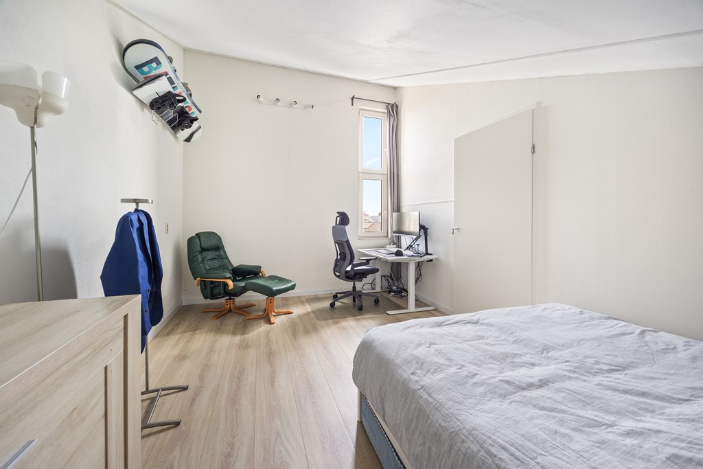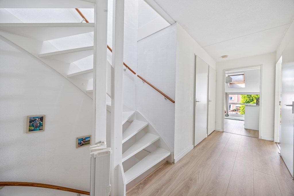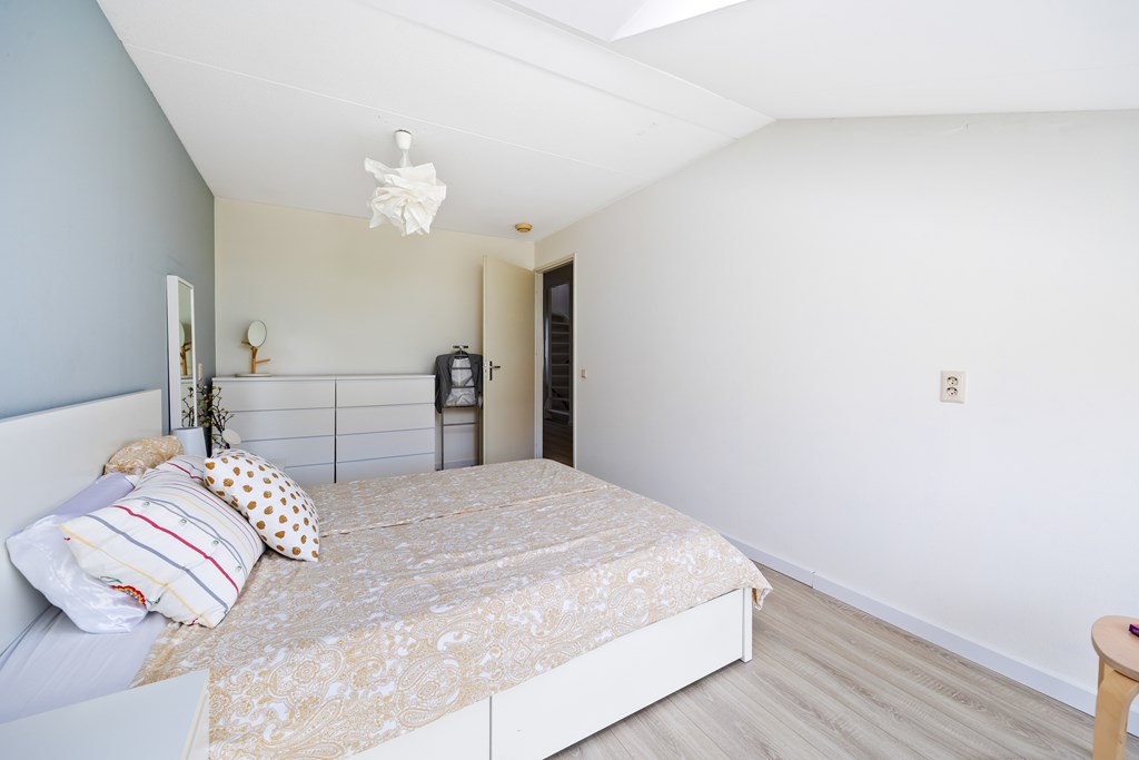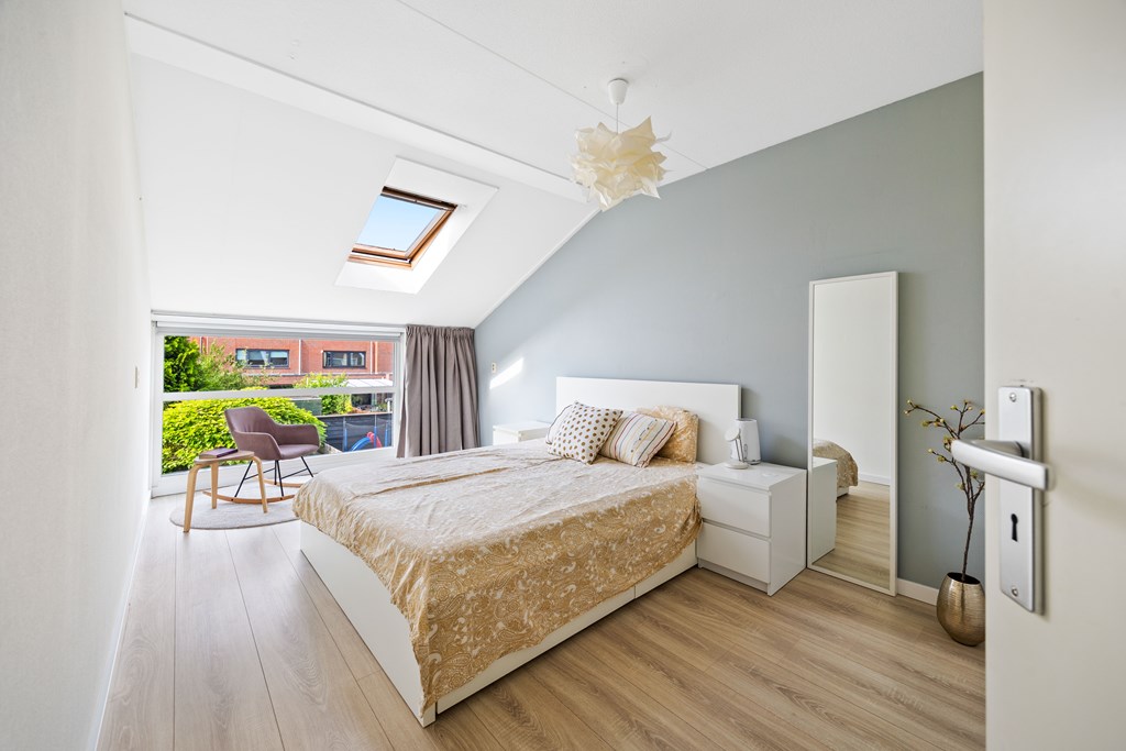 Via de trap in de hal bereikt u de eerste verdieping waar u beschikt over drie lichte slaapkamers. Twee ervan zijn gelegen aan de achterzijde van de woning. Ze beschikken over een breed raam en een extra dakraam in het schuine vlak. Slaapkamer drie bevindt zich aan de voorzijde. Hier zijn alle wanden recht en is er eveneens veel lichtinval. Naast deze slaapkamer is een (onopvallende)walk-in closet gecreëerd, bereikbaar via de overloop die net als de slaapkamers bekleed is met laminaat.