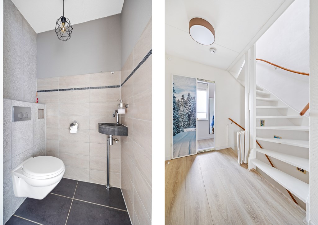 De badkamer is uitgevoerd met grote tegels op de vloer en de wanden, en voorzien van een dubbel wastafelmeubel met grote verlichte spiegel, en een heerlijk ruime instapdouche met rain shower. Het tweede toilet vindt u hiertegenover, in een aparte ruimte. Naast het toilet is nog een extra berging waar ook de CV ketel hangt.