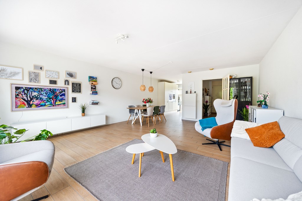 Lichte woonkamer, open keuken, dubbele openslaande deuren