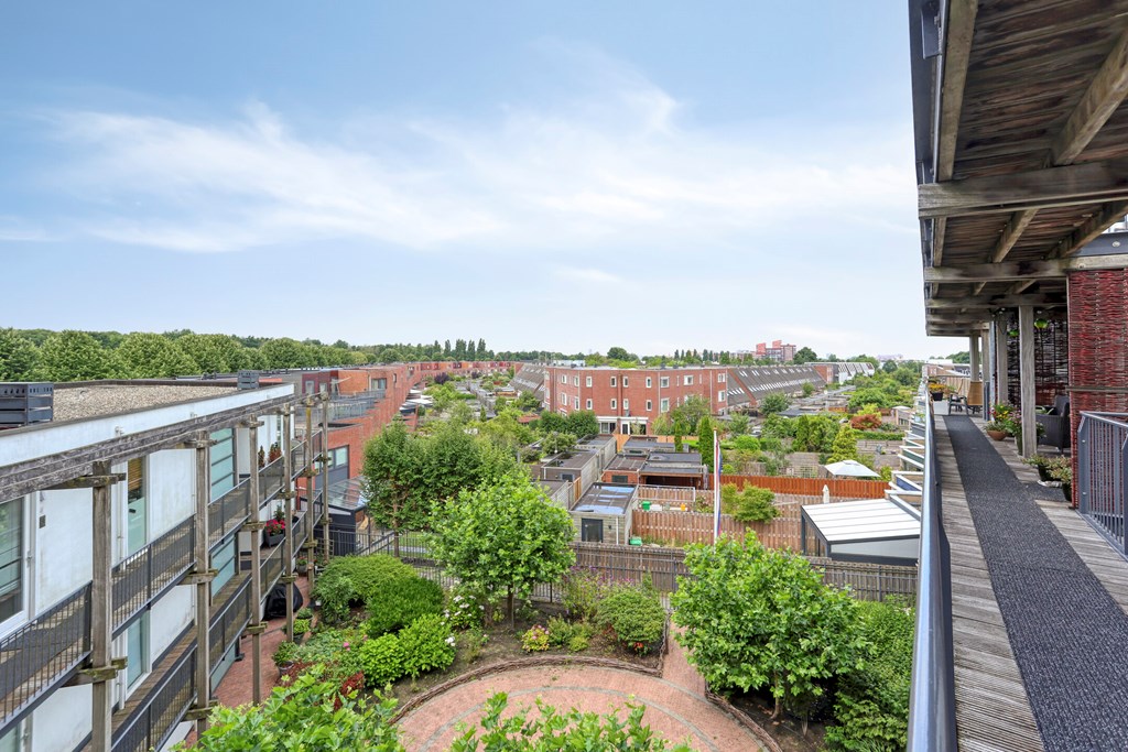 Dit meer dan royale balkon of desgewenst terras, kunt u bereiken via de voordeur, maar ook vanuit de woonkeuken. Vooral de robuuste houten balken naast en boven u geven deze plek karakter en een waar vakantiegevoel. U kijkt mooi weg over de daken naar de groenstrook erachter en de zon zorgt voor de rest.. Stelt u zich de zwoele zomeravonden eens voor: tafelen met vrienden, of een boek lezen met een heerlijk glas wijn. Tip: kijk ook even naar beneden, op de mooie binnentuin.