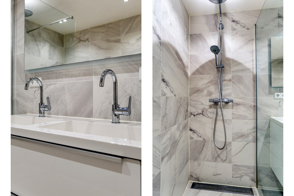 Back in the hallway, directly opposite and to your left, you’ll find one larger and one smaller bedroom. Both rooms feature new wood-look PVC floors. Next to the main bedroom is the renovated (2021) bathroom, fully tiled and fitted with a spacious walk-in shower, double washbasin and underfloor heating. You’ll also find a toilet refurbished in the same style, as well as a generous laundry and storage space, all accessible from the hallway. The hallway also houses the meter cupboard with a new mechanical ventilation unit.