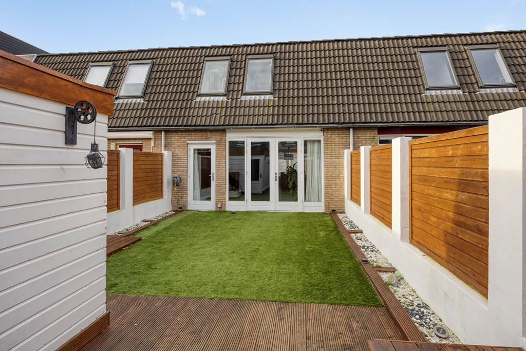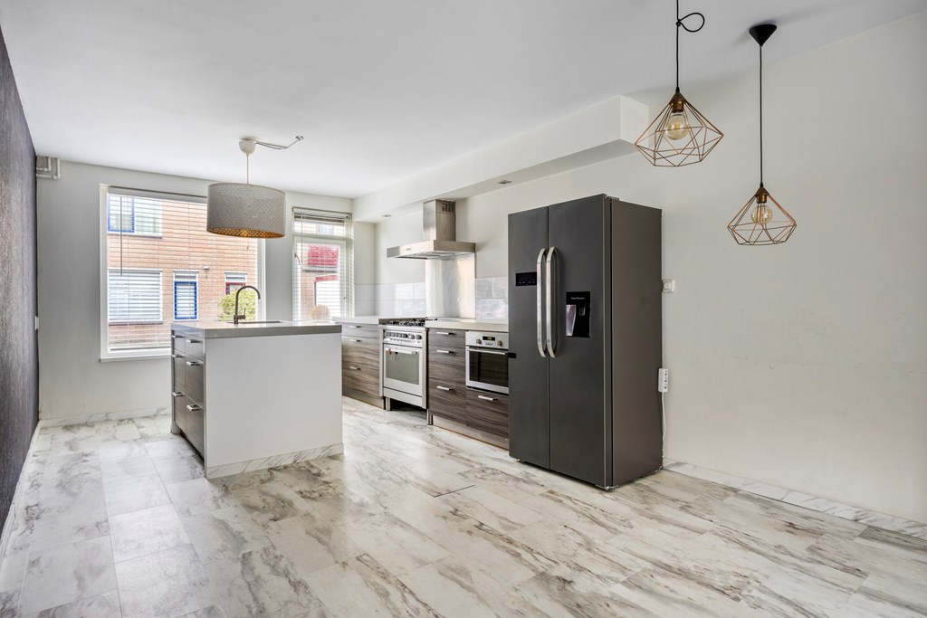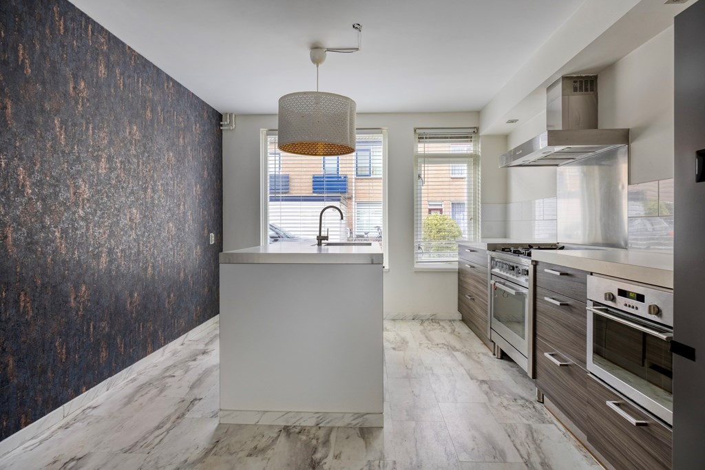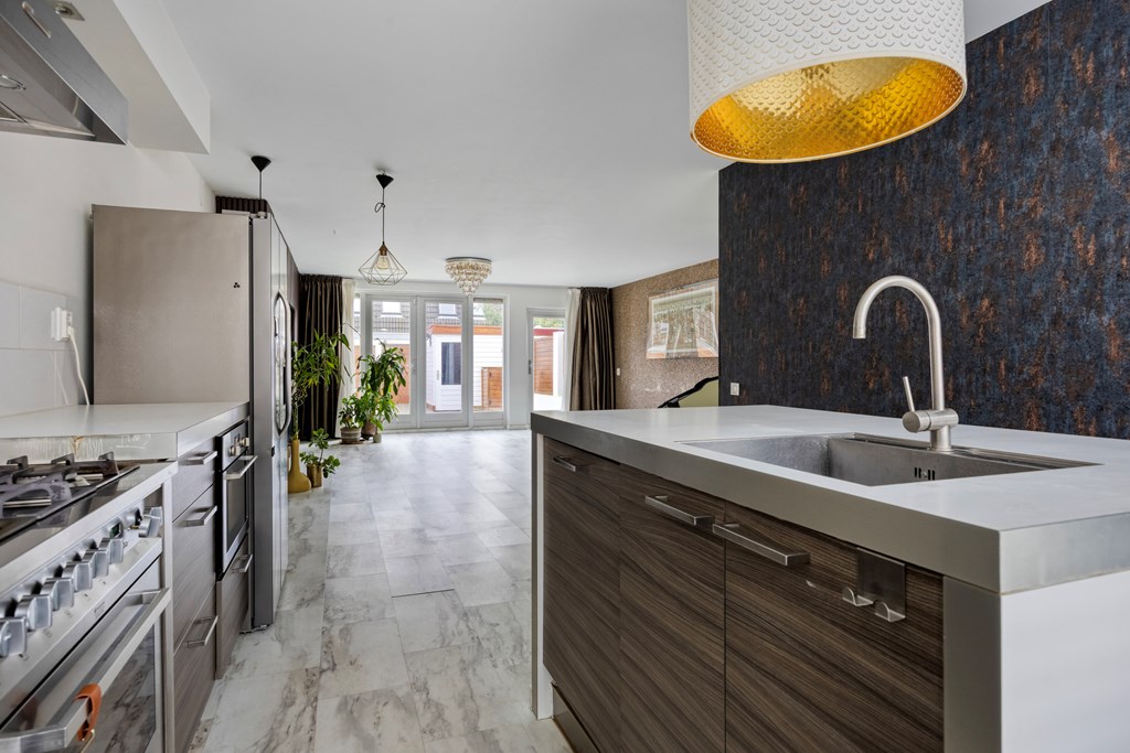 Vanuit de ruime woonkamer heb je zicht op de tuin. Aan de achterzijde van de tuin is een terras gerealiseerd met vaste houten banken waar je met veel bezoek heerlijk tijdens lange zomeravonden kunt borrelen. Aangezien er geen vaste planten zijn aangeplant, kan je de tuin met potten nog helemaal naar je eigen smaak aanpassen. Terug in de woonkamer lopen we naar de keuken die aan de voorzijde van de woning ligt. Gezellig zicht op de straat terwijl je staat te kokkerellen. De keuken is erg mooi met warme houten panelen en een wit aanrechtblad. Een groot fornuis met vijf pitten en een eiland met spoelbak. De keuken is in 2018 vernieuwd en daardoor is hij nog echt helemaal van deze tijd. Op de benedenverdieping vinden we ook het volledig betegelde toilet met tijdloze witte tegels.