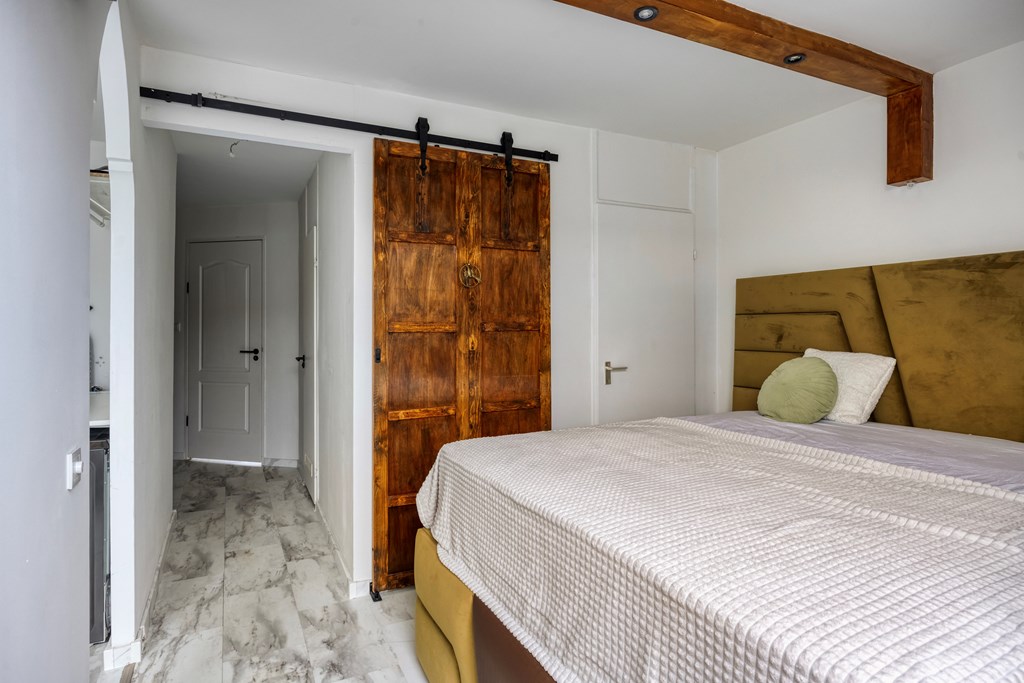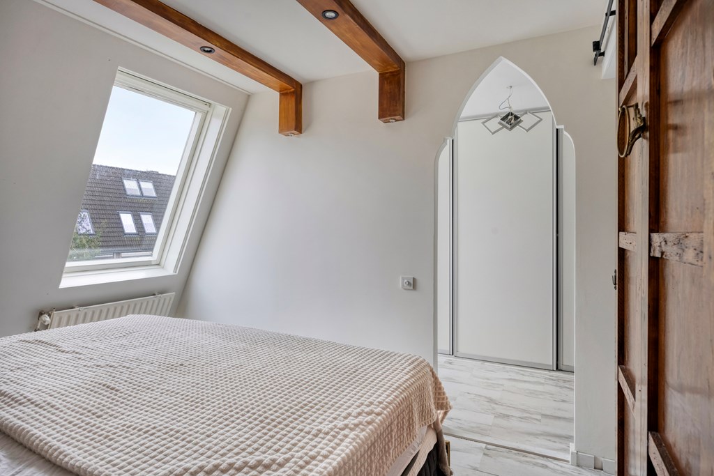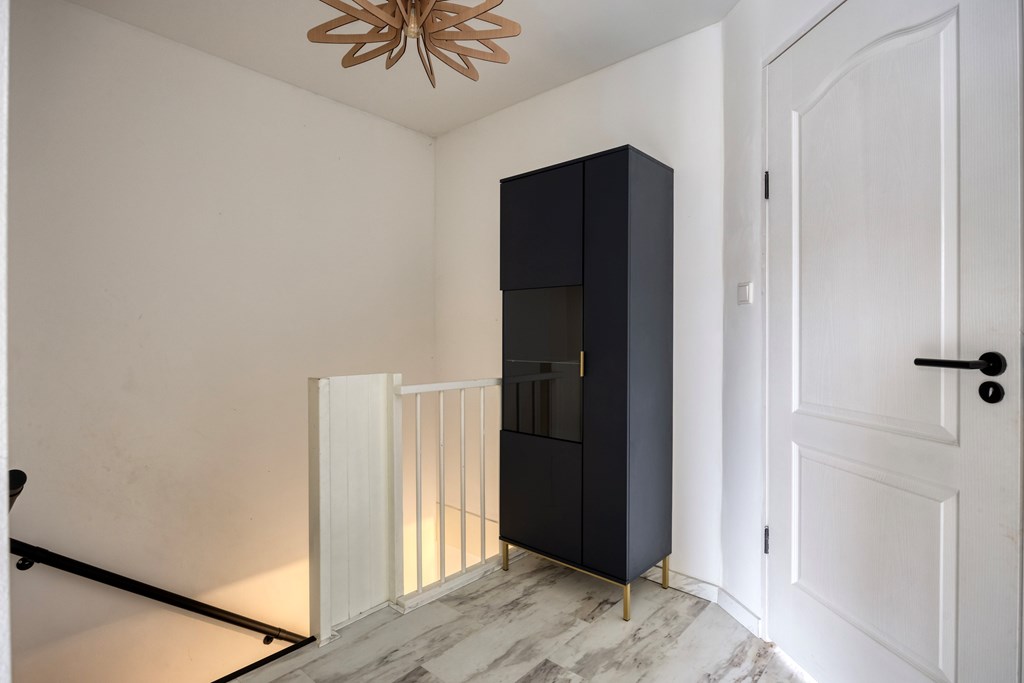 We gaan naar boven waar twee ruime slaapkamers en een kastenkamer zijn. Vanuit de slaapkamer aan de voorzijde van de woning kom je in de kastenkamer waar ook de aansluiting voor de wasmachine is. Deze eerste slaapkamer is extra sfeervol gemaakt met houten balken met spotjes en een mooie houten schuifdeur. De tweede ruime slaapkamer heeft een mooie sfeerverlichting en ruimte voor een grote televisie. En dan de badkamer die ook op de verdieping is. Fraai tegelwerk, een groot wastafelmeubel met goudgekleurde waskommen zorgen voor veel sfeer en warmte en bovendien voor veel opbergruimte. In de badkamer kan je heerlijk badderen in het ligbad maar er is ook een aparte douche. Kortom, de badkamer is van alle gemakken voorzien.