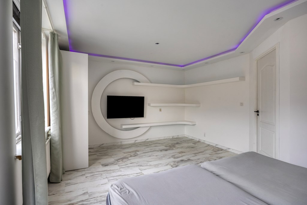 • Sfeervolle cinewall in de woonkamer met geïntegreerde kastruimte, wat zorgt voor een strak en opgeruimd geheel