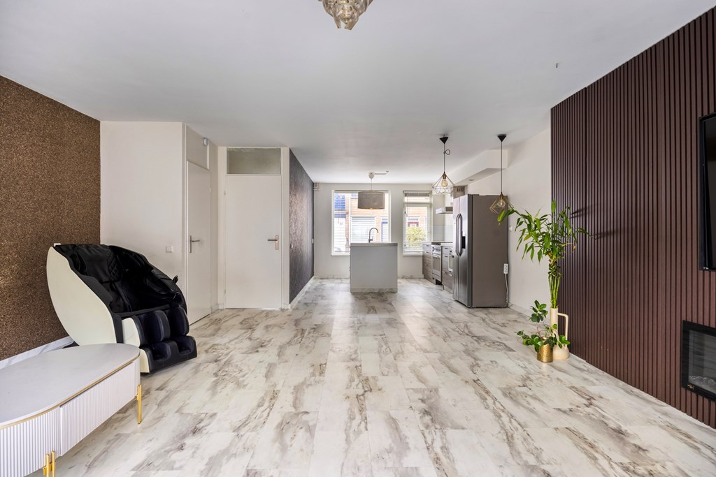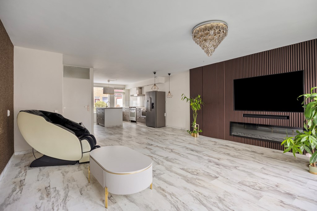Via de onderhoudsvrije voortuin, kom je de woning binnen. De hele beneden verdieping heeft een fraaie pvc vloer. Het is mooi dat de vloer over de gehele verdieping is doorgetrokken want dat maakt het één mooi geheel. Eyecatcher in de woonkamer is zonder twijfel de cinewall met kastruimte zodat alle losse spullen netjes kunnen worden opgeruimd en je heerlijk kan genieten van je favoriete serie.